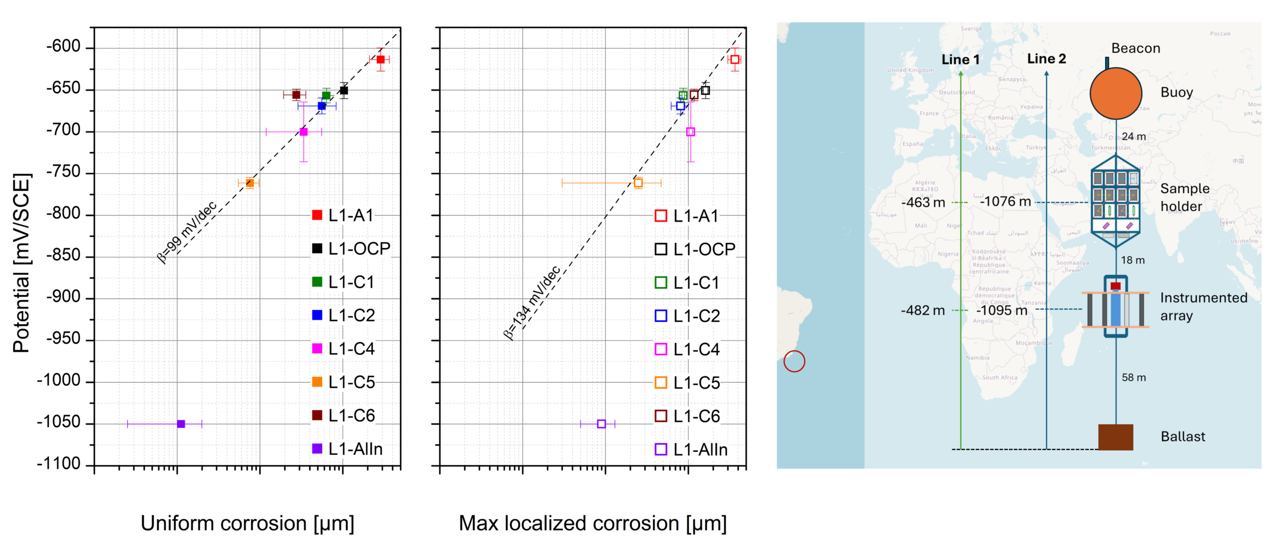 Two identical instrumented mooring lines were immersed for one year in the Campos Basin off Rio de Janeiro (Brazil) at 475 m (Line 1, Namorado field) and 1,085 m (Line 2, Barracuda field) depth, deployed and recovered by remotely operated vehicles (ROVs). Each line carried a sample holder equipped with carbon steel specimens (S235JR and DC01) subjected to various levels of pseudo-potentiostatic polarisation, imposed by combinations of galvanic anodes (AlIn, AlGa), shunt resistors and low-voltage diodes. Autonomous sensors continuously monitored potential, temperature, depth, current velocity, dissolved oxygen, salinity and electroactive biofilm. In parallel, a one-year comparative experiment was carried out in the laboratory in Brest in renewed natural seawater at 3.6 °C, under controlled potentiostatic conditions. Uniform corrosion was assessed by mass loss in accordance with ISO 8407 and localised corrosion by confocal digital optical microscopy.
