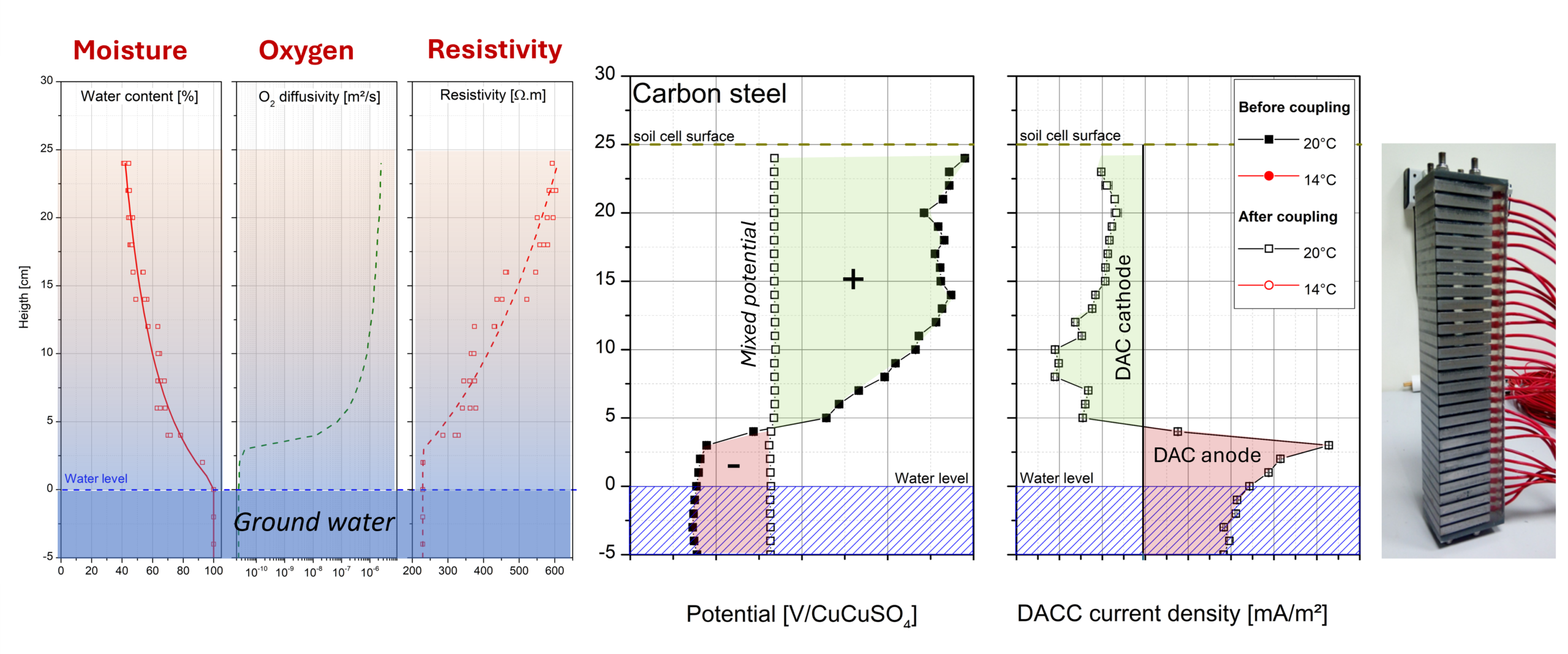 The study is based on two complementary approaches. Firstly, a specific DACC module consisting of 30 specimens of carbon steel or electrogalvanised steel (50×50×8 mm) stacked and separated by an insulating epoxy resin was exposed in two types of soil subjected to a vertical moisture gradient, reconstituted by capillarity from a bottom filled with deionised water. This setup allows individual measurement of the corrosion potentials and galvanic coupling currents before and after electrical connection of the specimens. Secondly, a one-year long-term exposure was carried out on S355 GP carbon steel and Z275 galvanised steel specimens in 0-4 mm sand, at four distinct moisture levels, under coupled and uncoupled conditions, in order to assess the associated mass losses and localised corrosion.