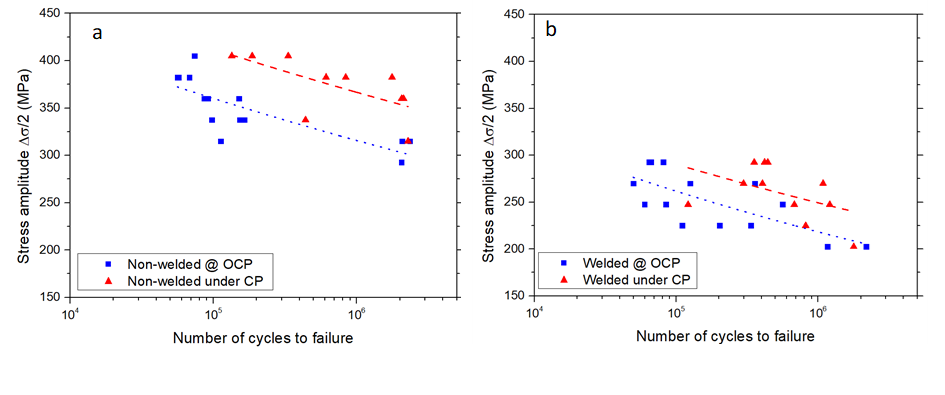Alternating four‑point bending fatigue tests were carried out in natural seawater, with and without cathodic protection. Fatigue behavior was evaluated as a function of environmental parameters such as temperature. Material parameters were considered as well, particularly