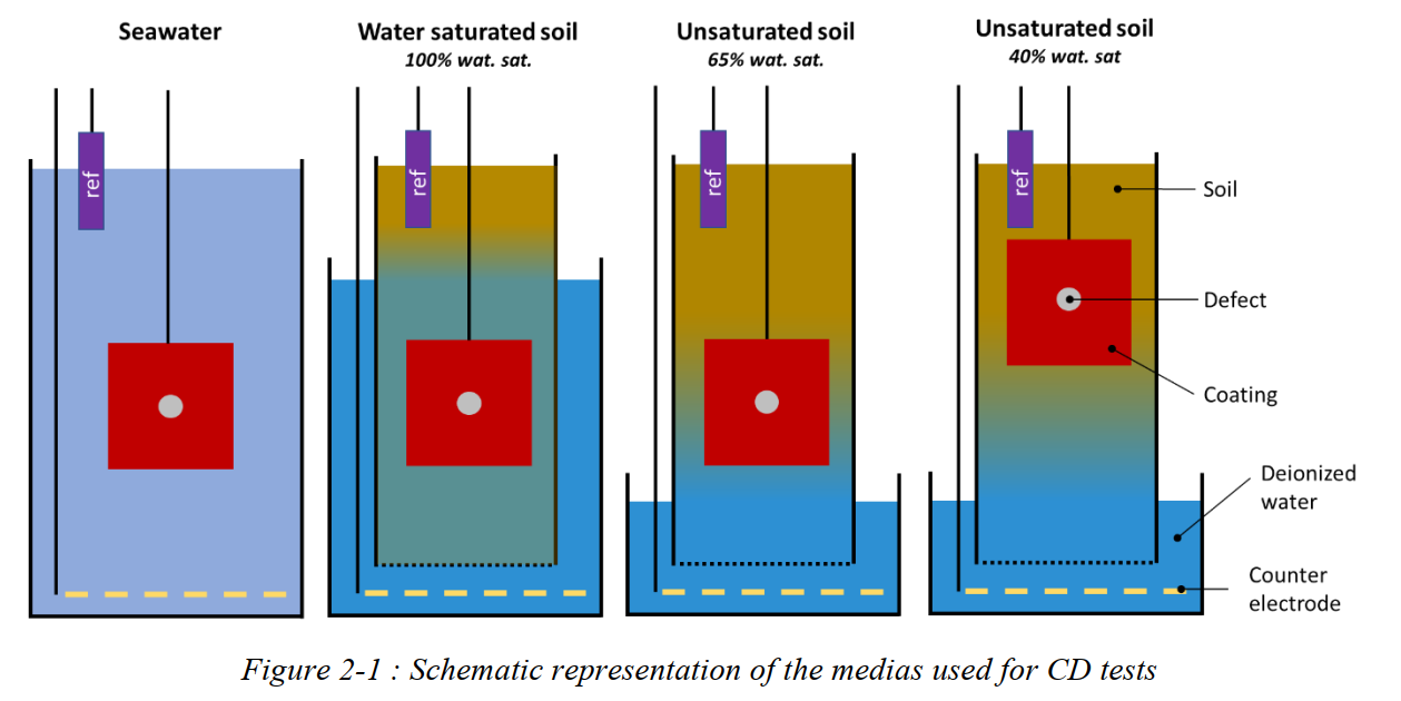 - Cathodic disbondment tests on coatings in soil environments with controlled water content