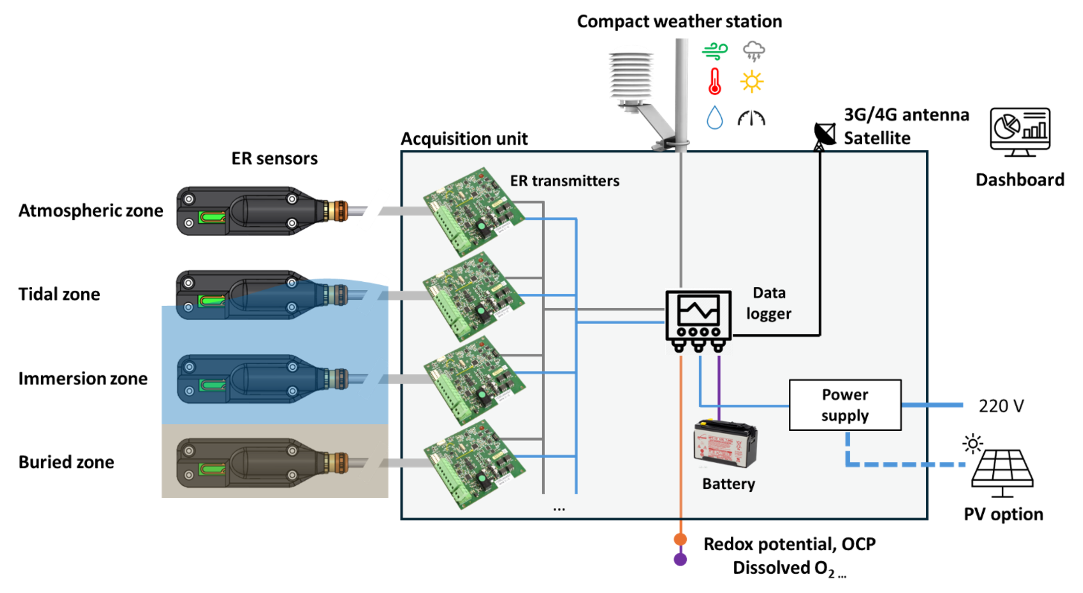 Thick ER sensors (1 to 4 mm), manufactured on demand from industrial materials, for atmospheric, immersed and buried environments. Several ER sensors as well as complementary probes for monitoring weather, hydrological or soil conditions can be integrated into a custom acquisition cabinet offering remote data access via a dedicated dashboard.