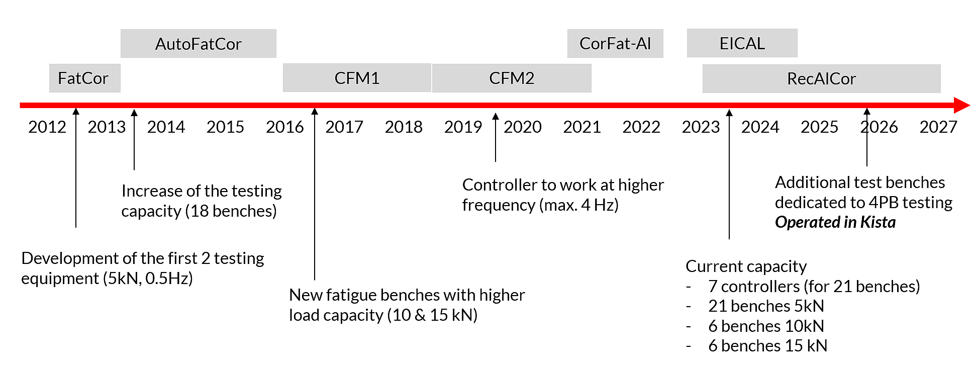 Les bancs présentent des performances en force allant de 5 à 15 kN, et des fréquences d’essai de 0 à 4 Hz. Ils permettent de tester des alliages métalliques ou des assemblages (boulonnés, collés, rivetés, soudés, …). Les derniers développements, en collaboration avec RISE, portent sur des bancs de fatigue en flexion 4 points avec une capacité maximale de 10 kN.