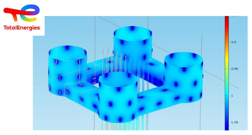 L’Institut de la Corrosion réalise le dimensionnement du système de protection cathodique des structures immergées. La distribution des anodes galvaniques ou le système de protection par courant imposé est optimisé par calcul et modélisation.