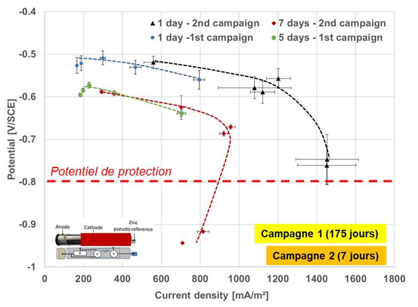 Nos ingénieurs réalisent des études de dimensionnement en courant imposé (ICCP) et par anodes galvaniques (sacrificielles), en tenant compte des paramètres déterminants tels que la résistivité des électrolytes, les surfaces à protéger, les densités de courant de protection et les durées de vie visées. Ces études s’appuient sur les normes en vigueur (EN ISO 15589, EN 13173, NACE SP0169, etc.), sur le retour d’expérience de nos équipes et sur la large base de données internes de courbes de polarisations réalisées en conditions réelles.